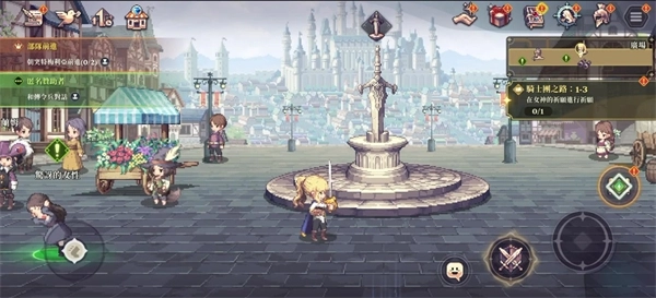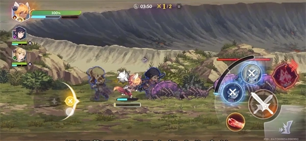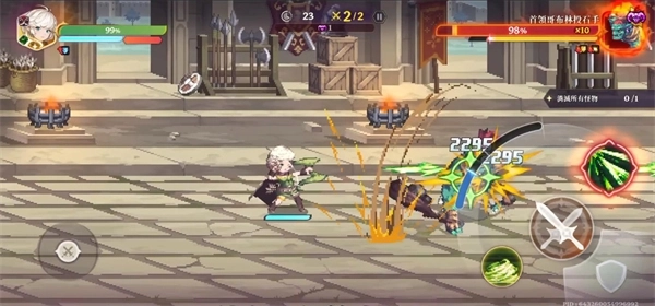 3、剧情结束后会进入战斗,屏幕左边控制角色的移动,右边的双剑图标是普攻,盾牌图标是防御,普攻按键两侧的是角色的技能,红色的是大招。