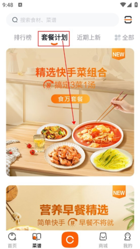 用户在菜谱页面点击上方的套餐计划即可查看菜谱制作套餐,选择一个自己心意的美食计划。