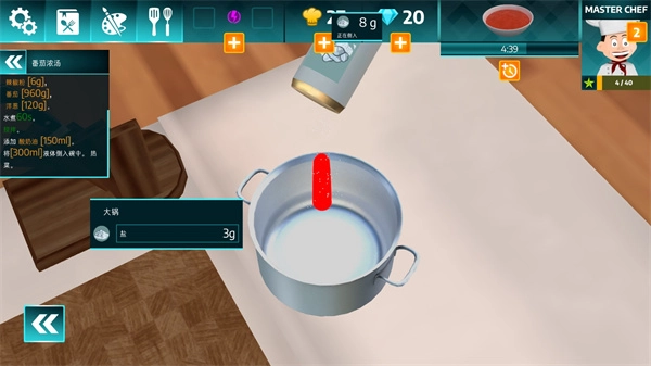 3、其制作的过程可谓十分真实,几乎都应用了真实的物理原理,举几个例子,像是切菜需要按照要求进行等份质量的切取,像是煎肉一段时间后需要拿着铲子进行翻面,像是给食物上调味料需要对准对应的位置等;