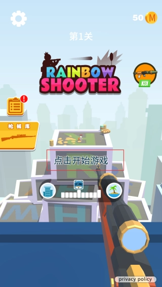 1、玩家完成游戏后,点击进入游戏主界面,在主界面中点击图标及开始游戏按钮,即可进入彩虹射戏关卡。