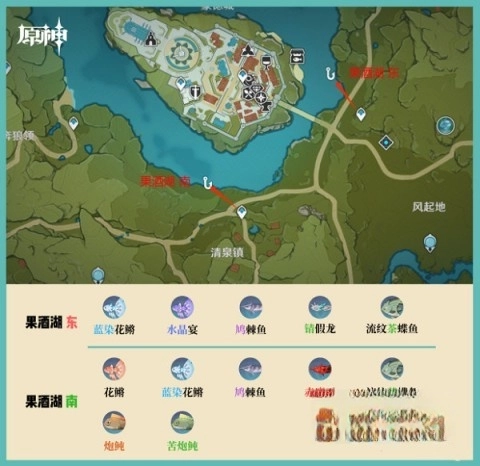 果酒湖东面有蓝染花鱂、水晶宴、鸠棘鱼、锖假龙、流纹茶蝶鱼;南面则有花鱂、蓝染花鱂、鸠棘鱼、赤魔王、流纹茶蝶鱼、炮鲀和苦炮鲀。