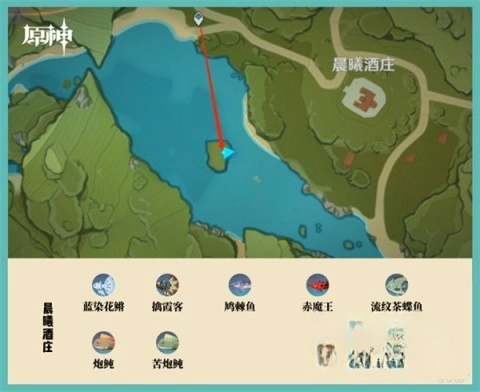 6、第六个钓鱼地点是晨曦酒庄,鱼类包括蓝染花鱂、擒霞客、鸠棘鱼、赤魔王、流纹茶蝶鱼、炮鲀和苦炮鲀。