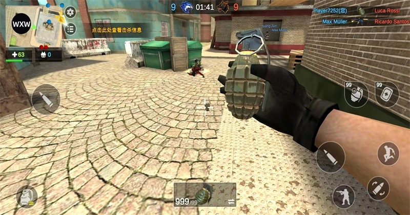 5、滑动屏幕左侧为人物移动,右侧为射击瞄准手雷等功能