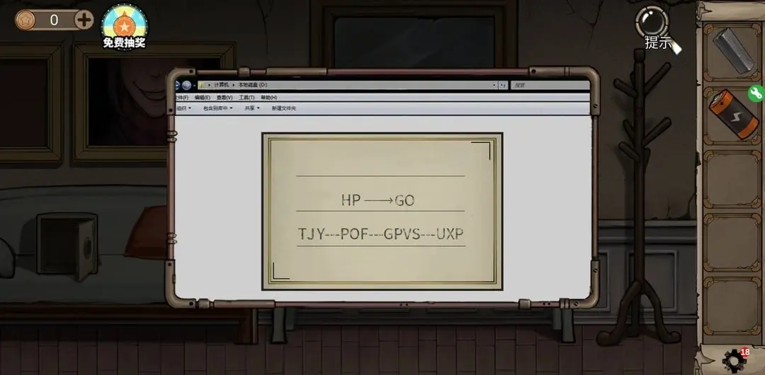 2.开电脑,电脑密码是电话拨号盘数字顺序,打开第一个文件夹,电脑谜题含义是往前一位的字母组合,six one four tow得到工具箱密码6142,拿到螺丝刀。