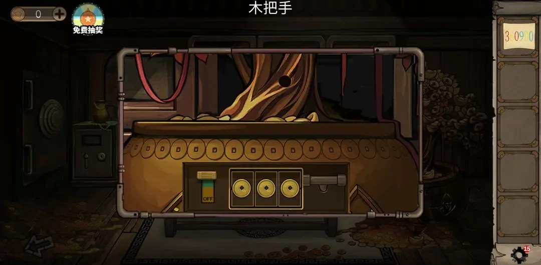 4.出门后4房间收集所有物品后,摇钱树on档点击数字,中间7数字是可以点击的,调成你想调的数字,将金币(7)和美元($)摇出,7是金币,$是美元,两个都要摇都要摇都要摇。
