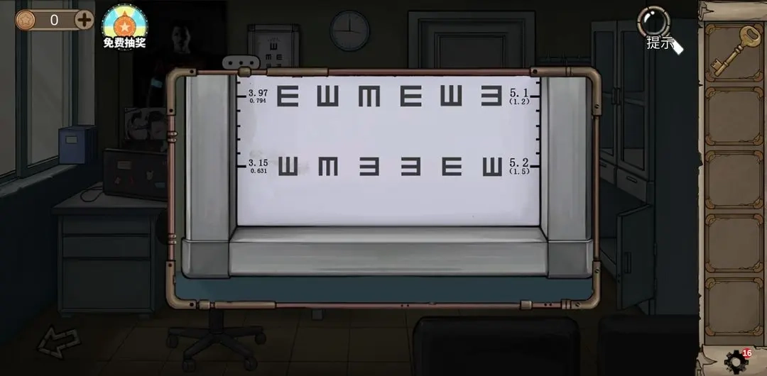1注意啦,椅子上放着清洁布,它是专门用来擦拭视力表的。另外,电脑小键盘的密码就在最后一排的方向,密码是824468 ,不过要记得先解锁小键盘哦。等成功解开电脑后,能看到一个密码9324 ,这个9324就是进门密码。之所以很多人看不出来这个密码,是因为只需要看白色部分就能知晓啦。