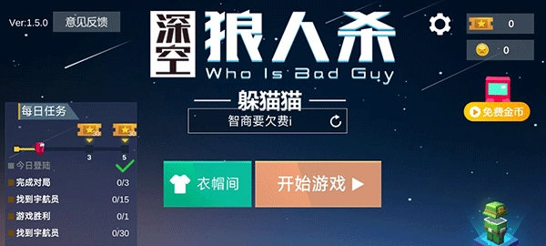 深空狼人杀躲猫猫是一款设定在宇宙太空站场景下的多人策略推理类游戏。在游戏里,玩家被划分为内鬼(狼人)与宇航员(好人)这两大阵营,各方通过隐藏自身身份、寻觅对手以及完成任务,来展开一场紧张又刺激的躲猫猫式对抗。其中,宇航员的目标是完成飞船准备相关任务,而内鬼的任务则是破坏太空站设施或者暗中暗杀宇航员。游戏过程中,玩家们会通过讨论交流,进而投票淘汰他们所认为的嫌疑人。此外,该游戏还支持组队协作玩法,队友之间能够彼此共享信息、一同制定战术,齐心协力地对抗敌方阵营。
