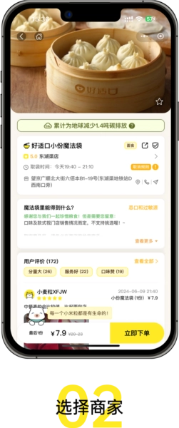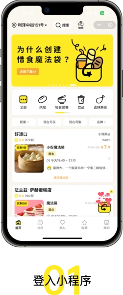惜食搭建起本地商家与用户之间的桥梁,商家把当日未能及时售出、但品质依旧完好的剩余食物装入魔法袋,用户通过预定的方式获取这些食物。如此,“商家 + 惜食 + 用户”三方共同发力,拯救那些原本会被浪费的食物。