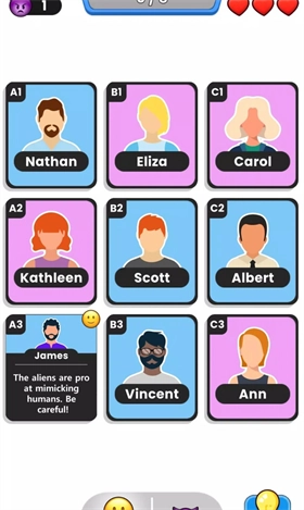 2、接着在游戏里,依据第一张卡牌上人物的文字提示,逐步找出好人和坏人。每个人下方都会有文字提示。