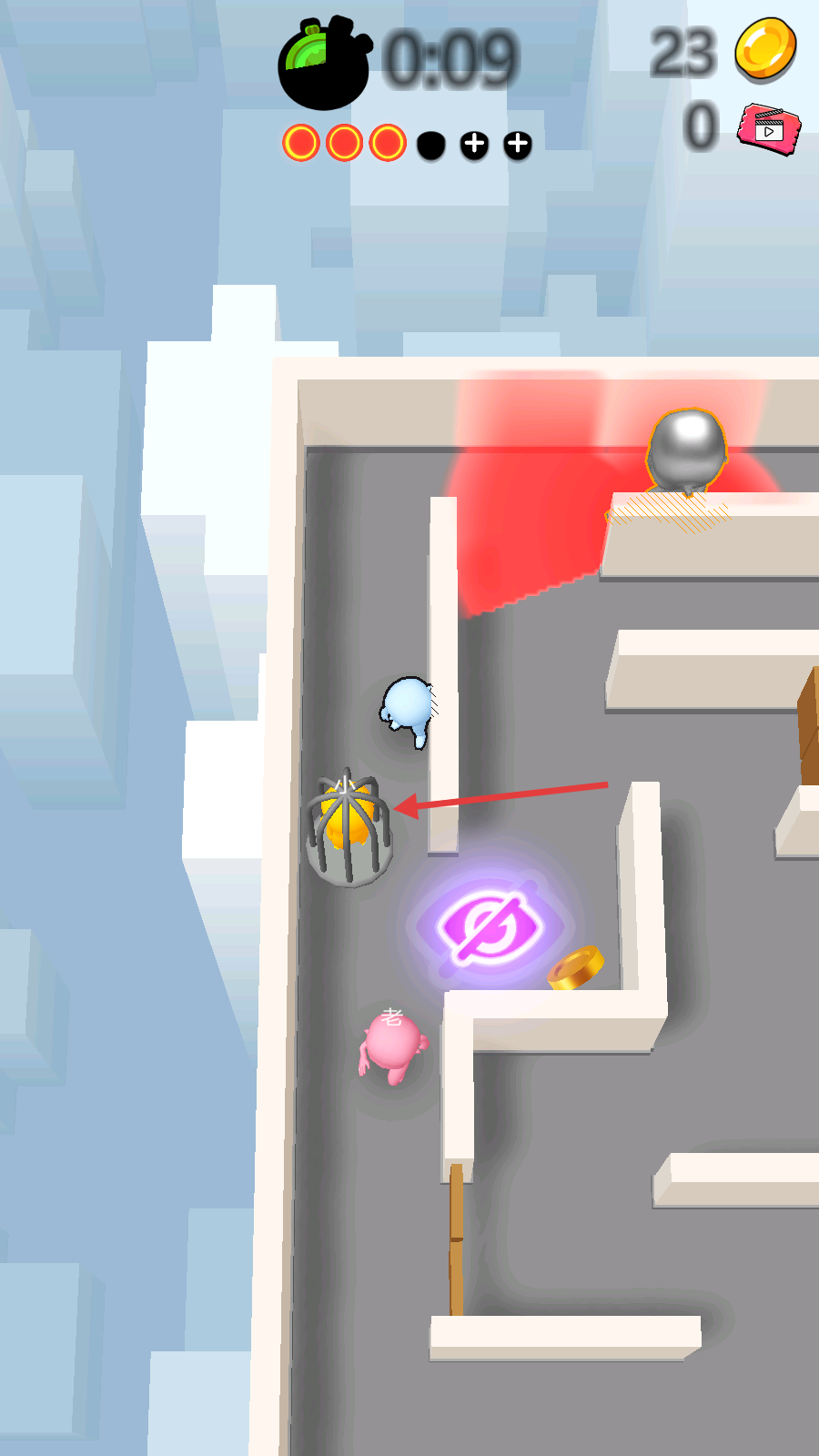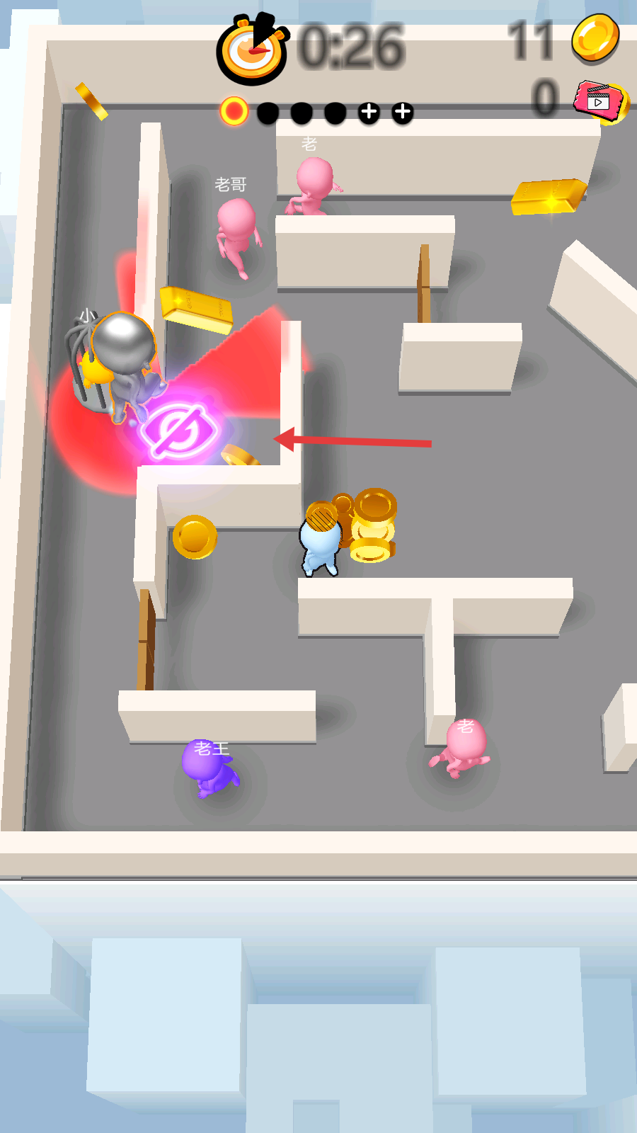2、看到敌方视线的红色区域,我们要绕到建筑后躲避敌人的视线,继续安全地收集金币等物品。