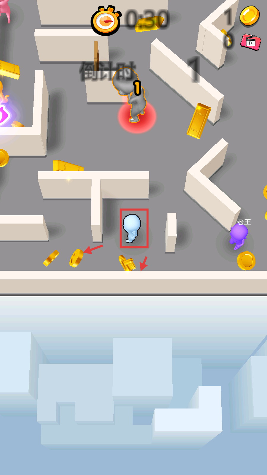 1、我们操控蓝色小人,在倒计时结束前,收集金币和金条,同时要留意周围的敌人,避免被发现。