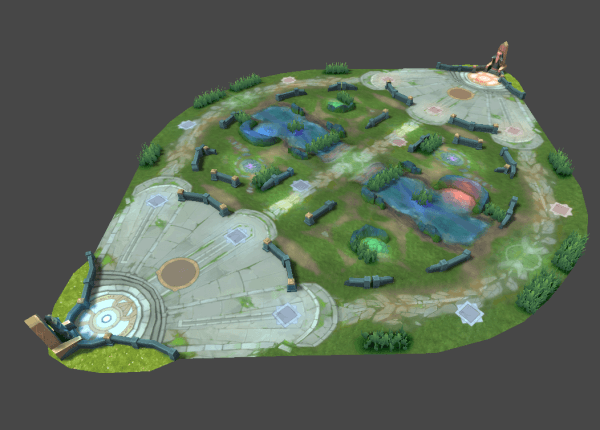 该地图类似山顶平台,对战双方各有3名或5名英雄,以一条从左上角延伸至右下角的对角线为分界线相互对峙。对角线左下方属于蓝方区域,而对角线右上方则是红方区域。在这个近似三角形地图的顶点位置,分别坐落着蓝方与红方的老家,英雄在此处出生或复活。