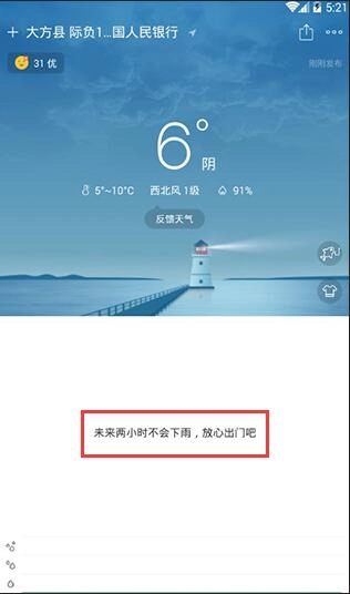 1. 若未来短时间内不会下雨,软件的天气界面不会展示降雨量折线图,而是显示“未来两小时不会下雨,放心出门吧”的提示信息,具体如下图所示。