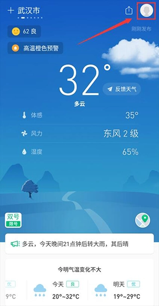 1、打开彩云天气的主界面之后,点击右上角的头像。