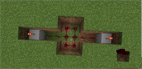 4、首先需要挖一个坑,按照下图摆好相应的红石、固体方块和红石火把