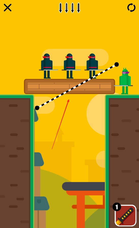 1、规划忍刀飞行轨迹:观察敌人位置与场景障碍,通过滑动屏幕确定忍刀飞行路径,利用墙壁等物体反弹,让刀精准击中目标,完成击杀任务。
