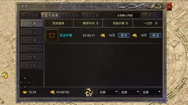 拍卖行主要分为2个类别:元宝拍卖、金币拍卖。