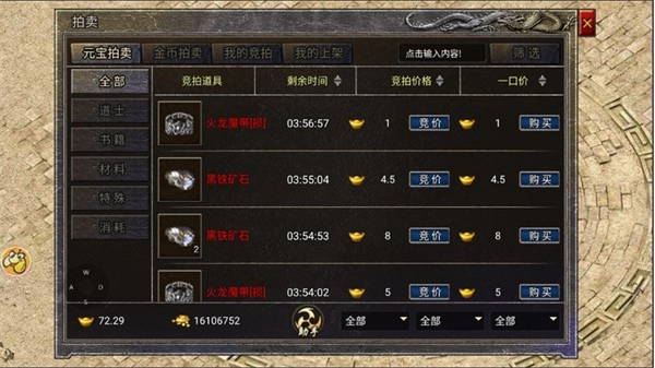 元宝拍卖:上架与竞拍的拍品都是用元宝进行交易,里面的拍品通常都是价值较高的装备和材料,勇士们可以按需买入。