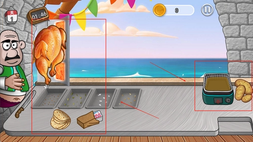 2、左侧是厨房操作区域,包括切菜、炒制、装盘等功能;右侧显示当前订单与顾客需求提示。