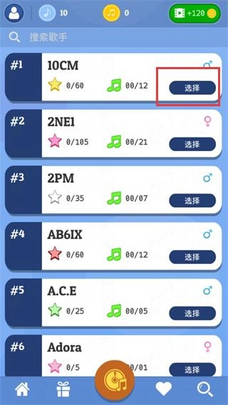 2、开始游玩之前,我们需要先在下方导航栏的中间板块当中,这里我们可以搜索歌手来选择音乐。