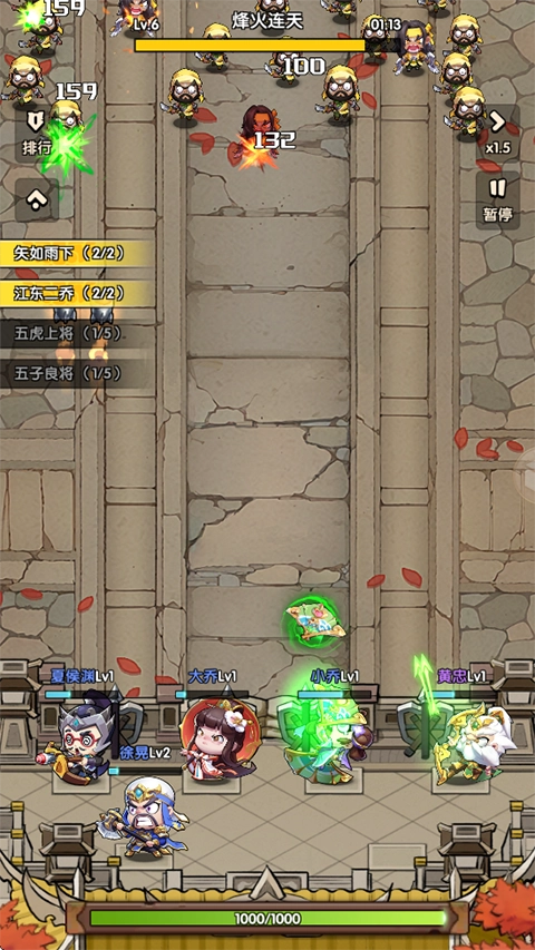 获得胜利的方法永远不会相同。猎杀小兵以收集金币、升级武将。每个游戏关卡都有不同的精英boss、敌人和惊喜,让主公们不断完善武将小队。选择正确的上阵策略,争取胜利!
