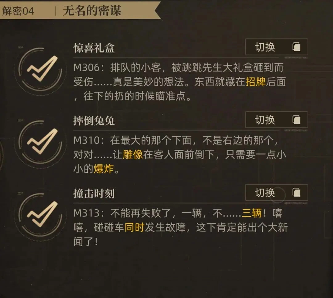 然后是第三章的3个解密,分别对应关卡为M306、M310和M313这三关,具体的解锁条件与站位如下: