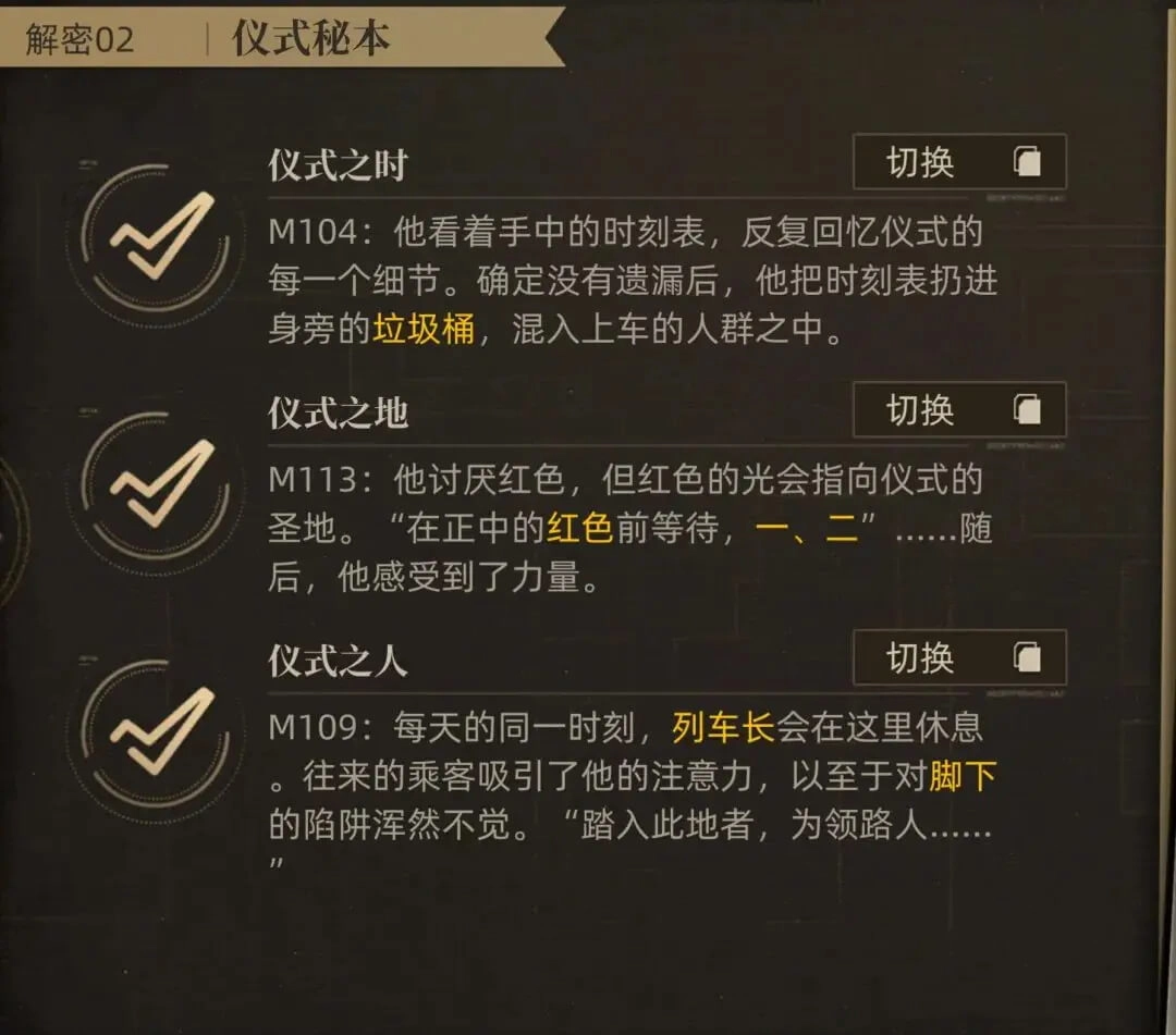 然后是第一章的3个解密,分别对应关卡为M104、M109和M113这三关,具体的解锁条件与站位如下: