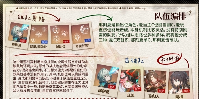 1. 组队思路:以那刻夏作为核心角色,搭配乱破、忘归人以及阮梅。借助那刻夏全属性弱点辅助的能力,其额外战技还能提供控制效果,以此来压缩敌人的行动空间,从而适配击破体系。
