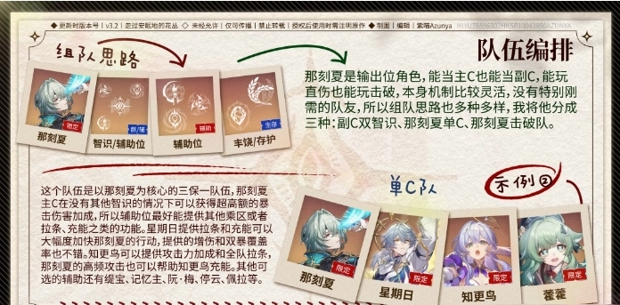 1、组队思路:那刻夏单核主C,搭配星期日(聚怪)、知更鸟(增伤)、藿藿(治疗);无其他智识角色时,借聚怪机制放大其爆伤收益。