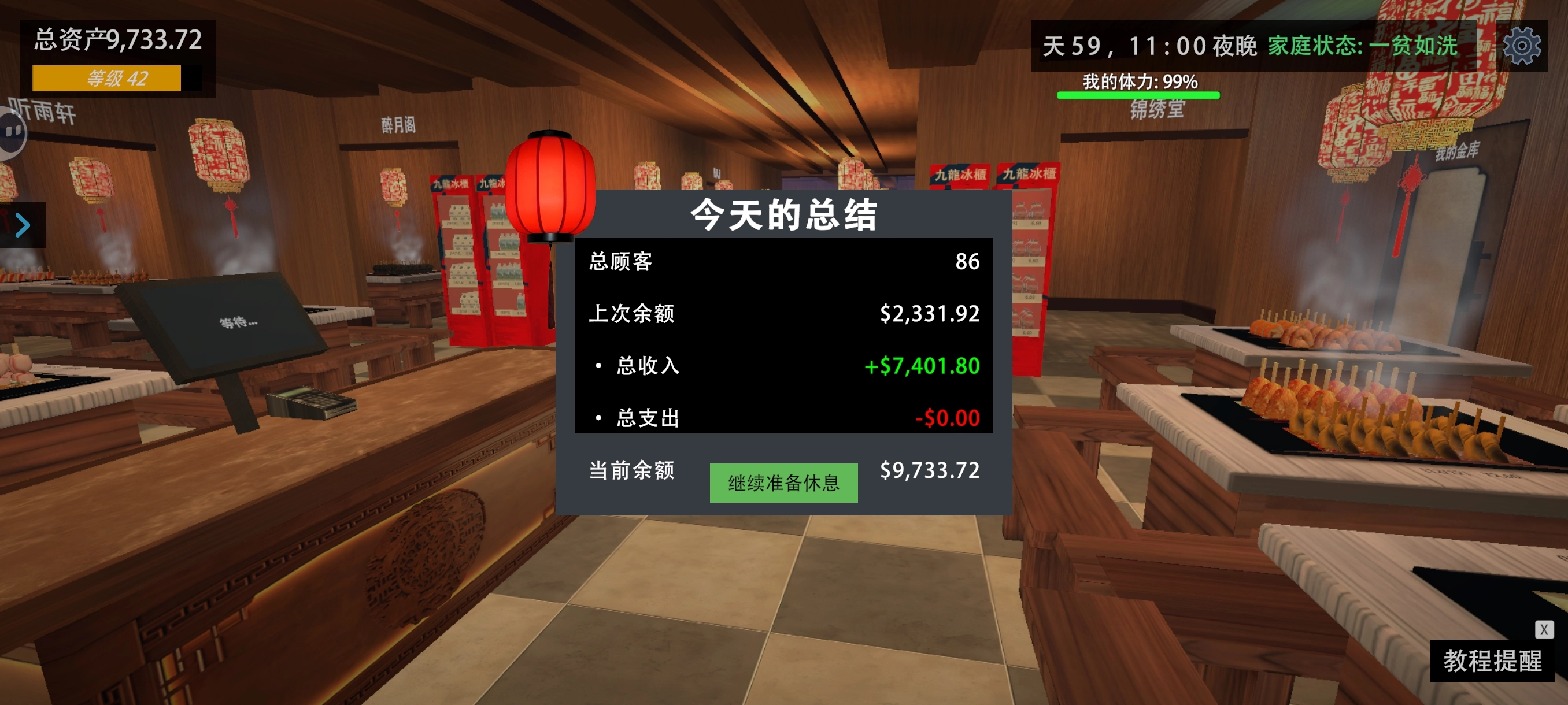 1、周期总结:每日结算(第59天)显示总顾客数为86,收支情况为(收入7401.80元/支出0元),通过数据可视化明确经营成果,以指导策略调整。