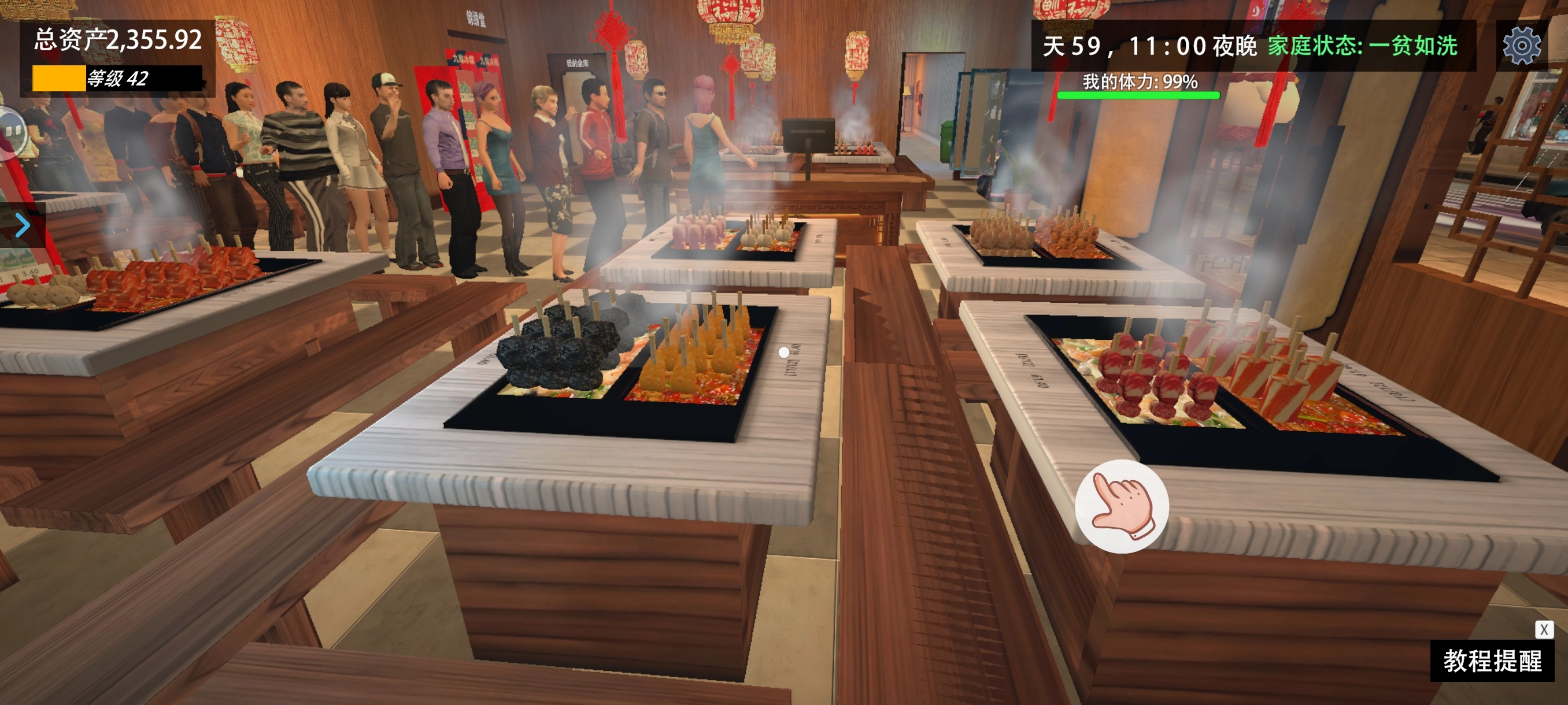 3、体力约束:体力99%限制单日操作(摆货、服务),形成“体力消耗→收益→恢复”节奏,避免玩法过载。