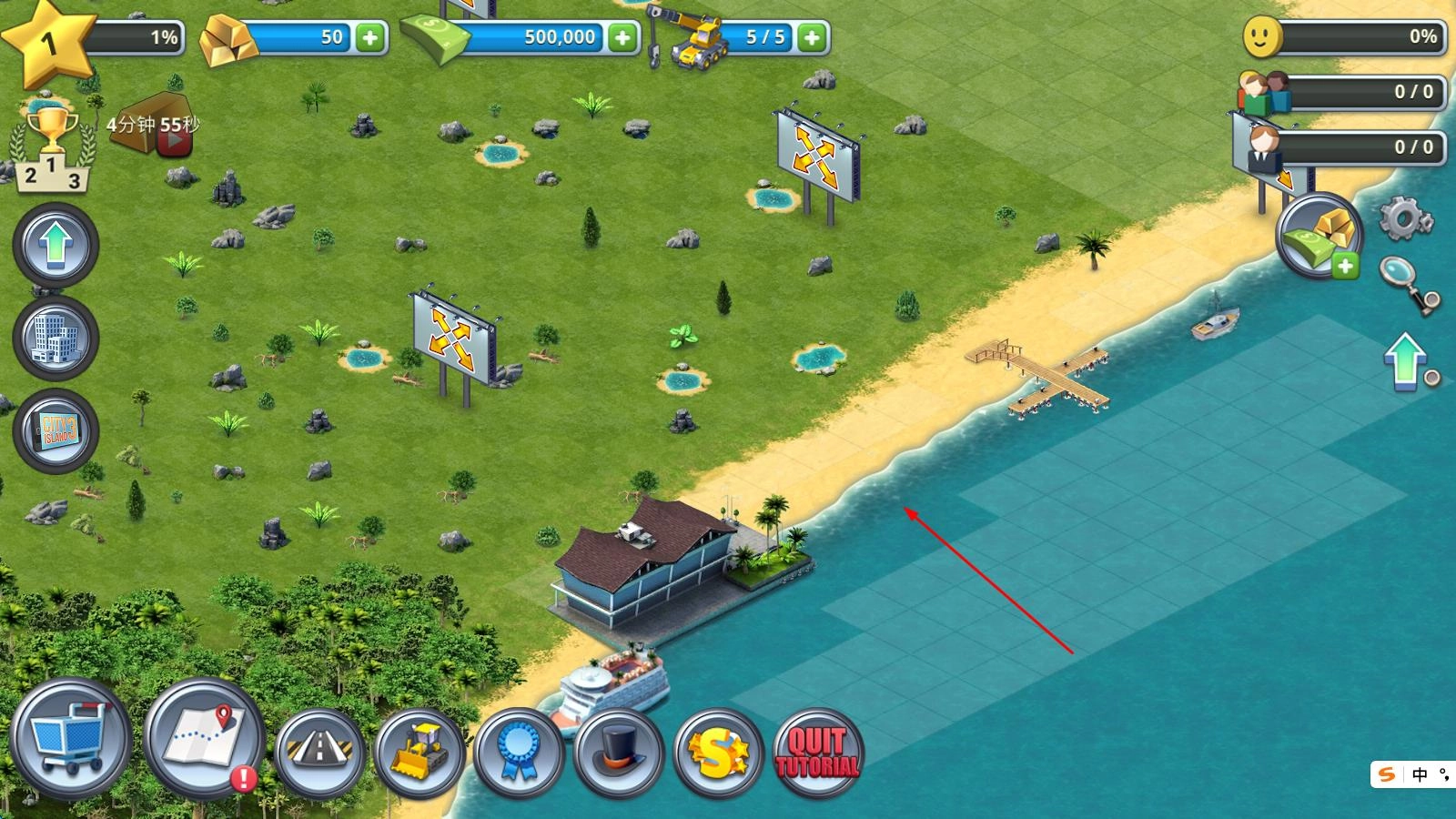 1. 刚进入游戏,起始于首个岛屿的村庄,通过建造基础住宅来吸引居民,搭建商业建筑以获取盈利,进而逐步解锁更多的基础设施。