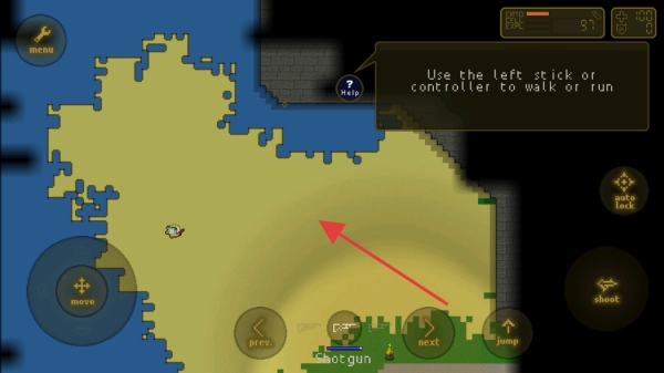 2、在地图场景,按提示用左侧摇杆(move)控制移动,探索黄色沙地,避开蓝色水域,熟悉操作。