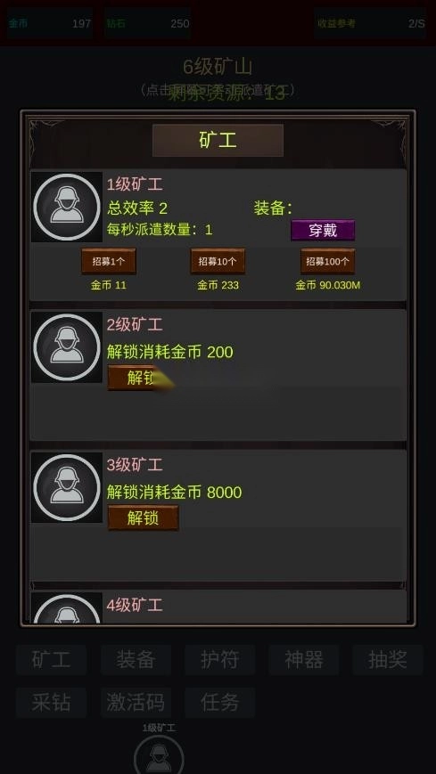 4.点击“矿工”,可以招募更多的矿工,有不同等级矿工等待招募,也可以招募更多数量的工人;