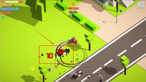 2、遭遇后方黑色追击车辆时,及时拾取"MINI GUN"道具反击,注意屏幕显示的伤害数值10,合理利用武器保护自己。