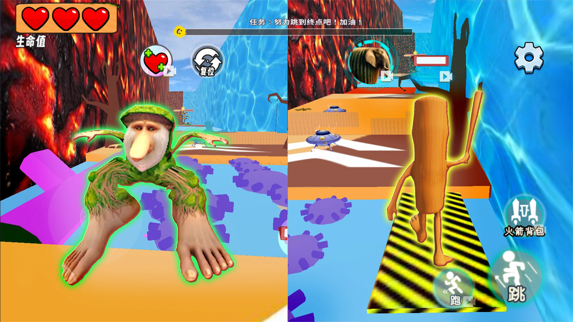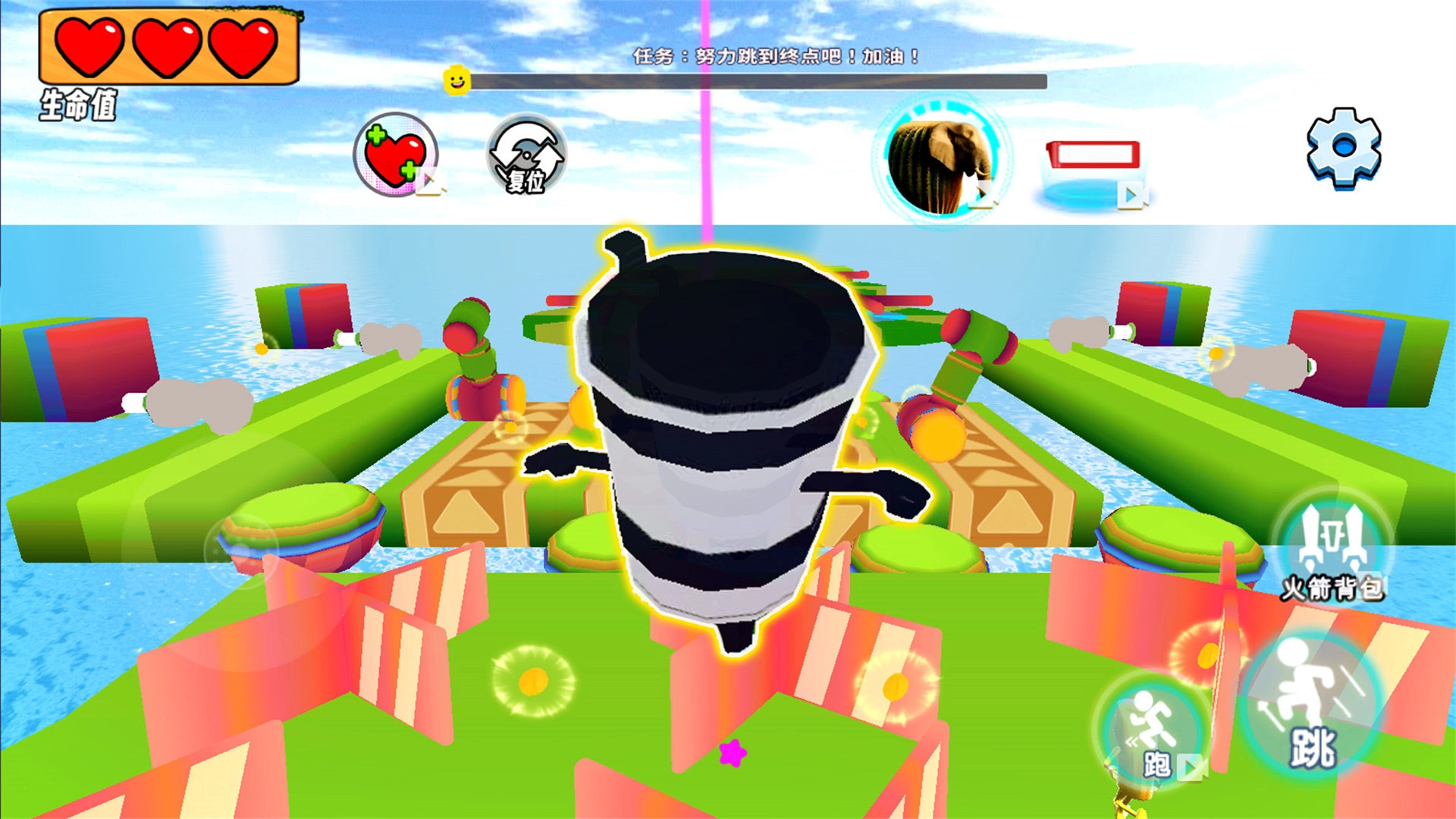 2、利用场景道具火箭背包,关键时刻加速飞越,甩开木棍人。