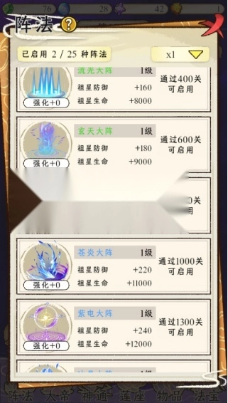3、消耗一定材料可升级/强化阵法,等级越高,阵法效果越高;