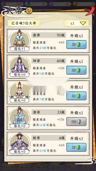 3、消耗一定材料可升级/强化大帝,等级越高,大帝效果越高;