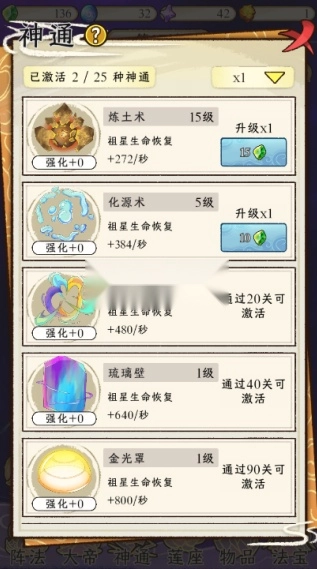 3、消耗一定材料可升级/强化神通,等级越高,神通效果越高;