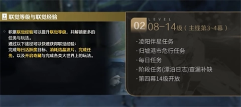 2、联觉等级8-14级,主线第三幕完结,第四幕在14级开启,开始卡主线等级,但同时开启了很多新任务,将凌阳:伴星任务、危行任务:归墟港市(不用跑图,自动传到任务地点) 这两个较为重要的任务做完,再领一下漂泊日志里的经验基本稳稳能达到14级,这期间依然不用太考虑其他支线,经验很充足。