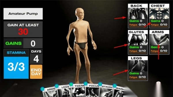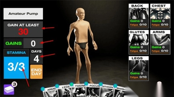 3. 左侧分别是目标、肌肉量、剩余天数、能量数,玩家需要在规定天数内达到目标才可以获胜。
