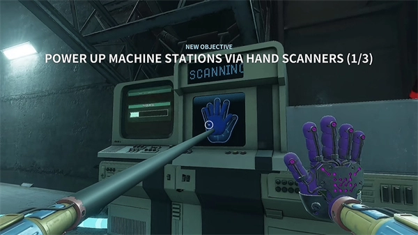 6、开门之后走里面还会有一个开关给他拉下来,往前走进去用蓝色手臂互动一下前面的开关,这里要触发三个开关才能有电流打通出口;