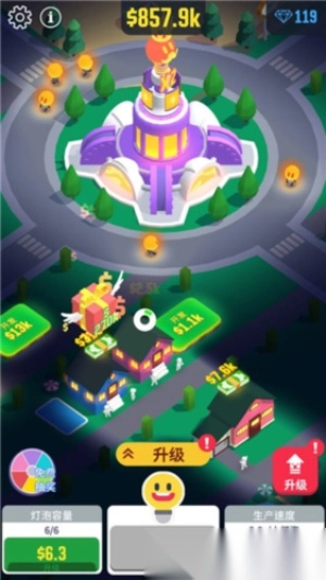 1.点亮建筑:在光明城市的中心位置是灯泡军团的世界工厂,花出1金币就会走出一个灯泡小人,它们会自己走进未被点亮、还是黑暗的房间,去照亮这些房间,等走入足够数量的小人之后,房间就会自行运转,产出金币增加城市的收益,就可以购买更多房子。
