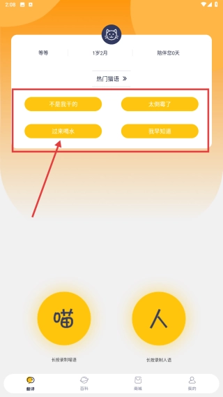 1. 来到首页,轻点热门猫语按钮,在诸如“过来喝水”等互动语中挑选,以此模拟与猫咪进行趣味交流,随后点击完成选择。