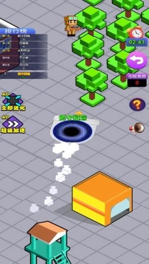 1. 通过滑动屏幕控制黑洞移动,靠近比黑洞小的物体就会自动将其吞噬吸收。