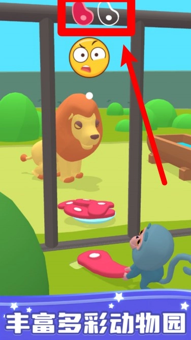 2.观察上方的食物提示,正确选择对应颜色的肉类投喂给动物,避免引发不满情绪影响动物的状态。