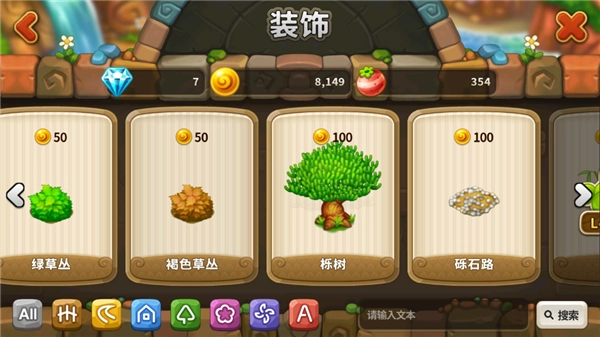 有了金币可以购买树木、绿草丛、砾石路等装饰品