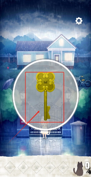 4、点击金色钥匙并捡起,红框会提示这是重要道具。此时背景正在下雨,需要寻找地方躲避。