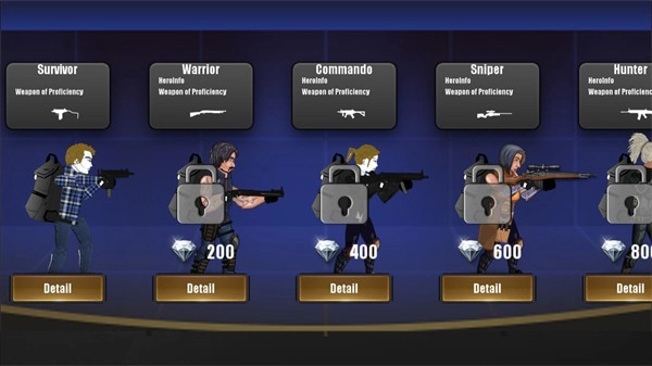 2、有多个英雄角色可以让你去选择游玩,每一位角色都有独特的武器可以让你去选择使用。