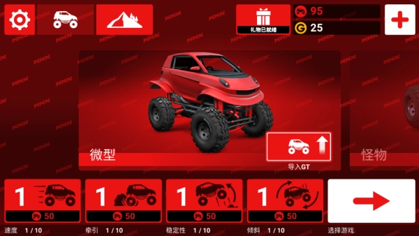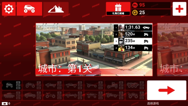 1.进入游戏后点击屏幕左上角的“汽车”图标,能够进入选择汽车的环节,选择你喜欢的汽车去挑战吧。